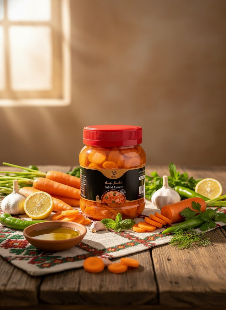 استمتع بمذاق مخلل الجزر الفلسطيني من أطياب الفلاحة، المصنوع يدويًا من أجود أنواع الجزر البلدي الطازج المزروع في أراضي الريف الفلسطيني الغنية.